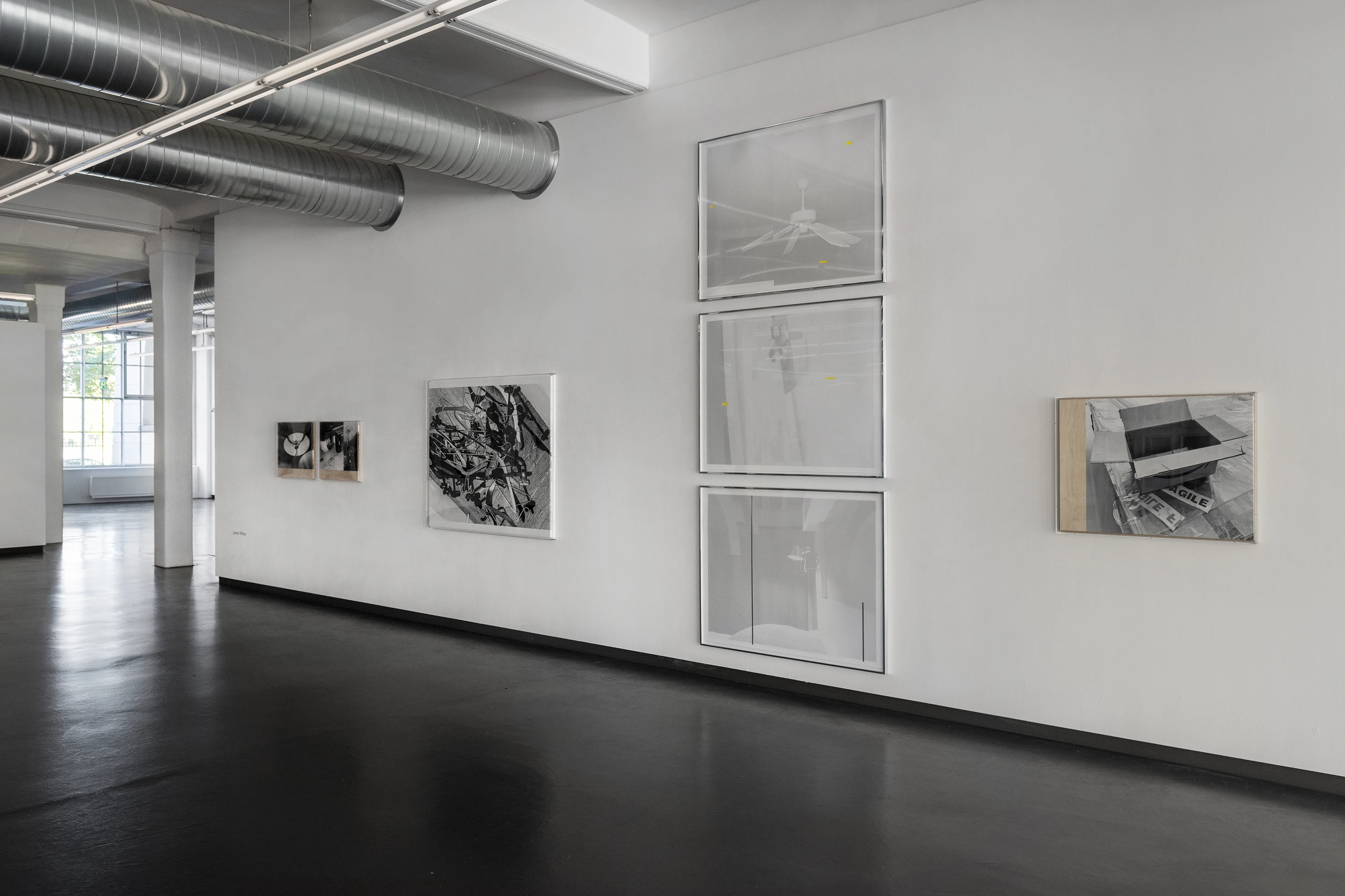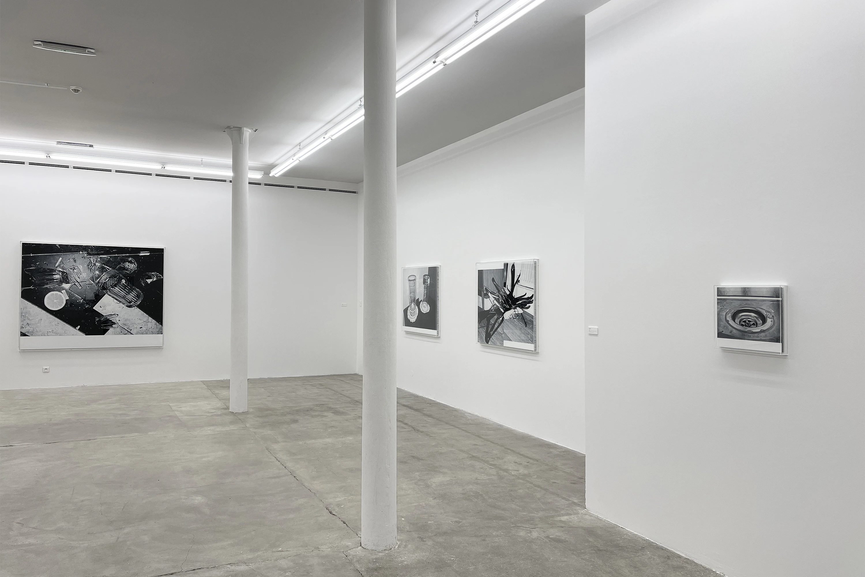 The choice to work exclusively in black and white accentuates this ambiguity. Without the distraction of color, the paintings operate within the tonal economy of both surveillance imagery and classic film noir. Shadows fall with heightened drama, surfaces gleam with the uncanny sharpness of photographic stills. This chromatic restraint is not merely aesthetic but conceptual: black and white positions the image in a zone of uncertainty, evoking both the documentary truth-claims of forensic photography and the stylised artifice of cinema. The result is an oscillation between testimony and fiction, in which objects seem to offer evidence yet resist definitive interpretation.