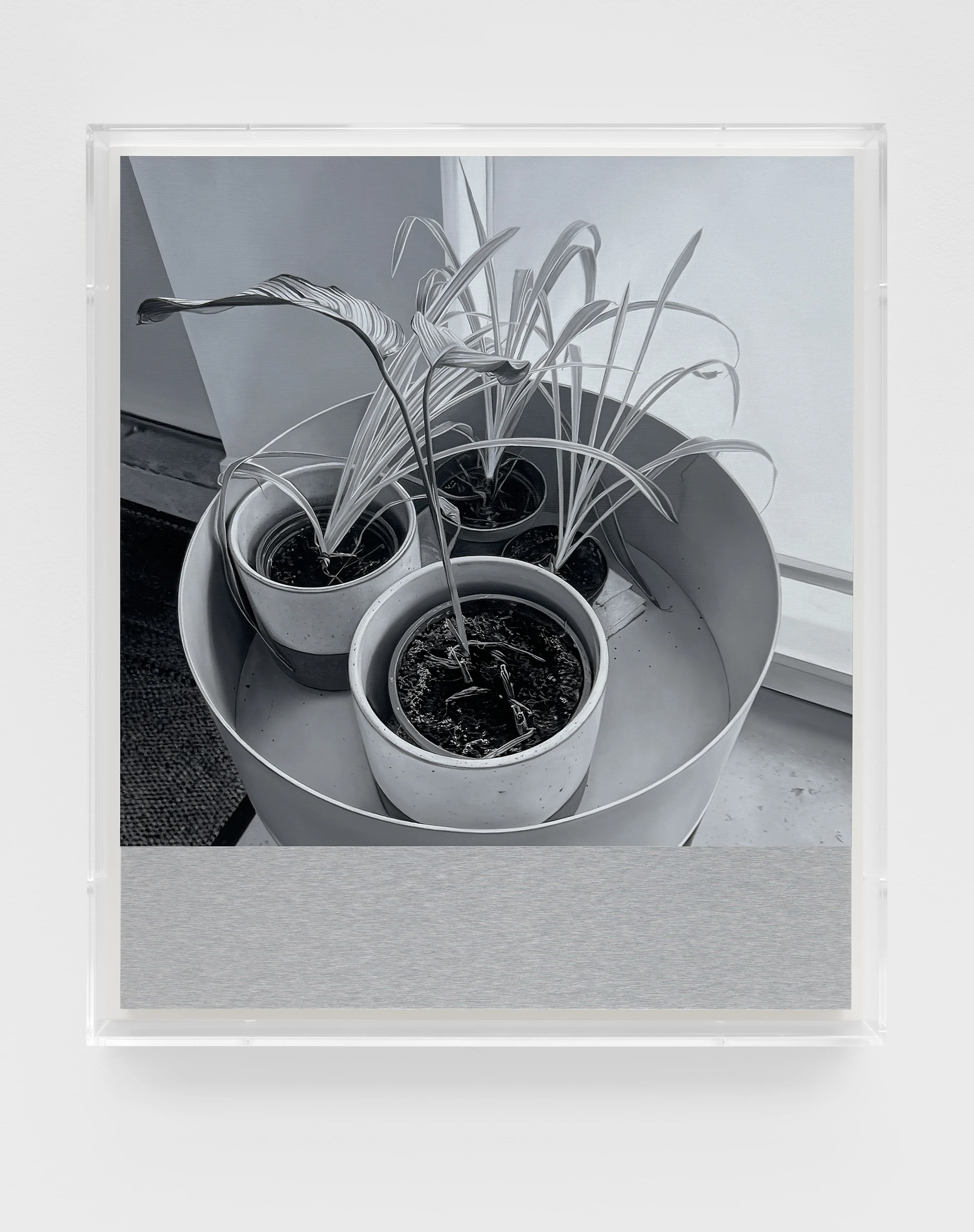 The choice to work exclusively in black and white accentuates this ambiguity. Without the distraction of color, the paintings operate within the tonal economy of both surveillance imagery and classic film noir. Shadows fall with heightened drama, surfaces gleam with the uncanny sharpness of photographic stills. This chromatic restraint is not merely aesthetic but conceptual: black and white positions the image in a zone of uncertainty, evoking both the documentary truth-claims of forensic photography and the stylised artifice of cinema. The result is an oscillation between testimony and fiction, in which objects seem to offer evidence yet resist definitive interpretation.