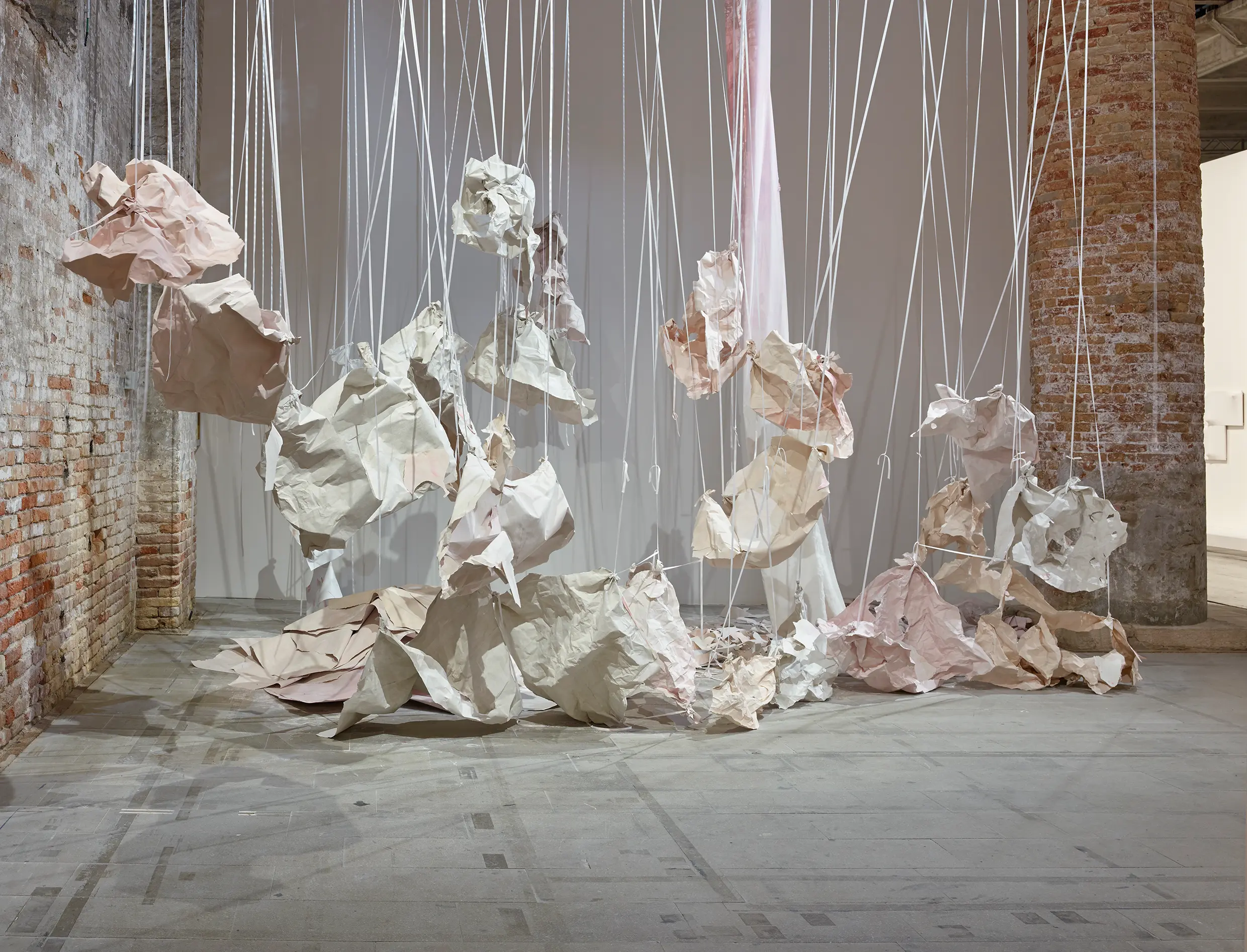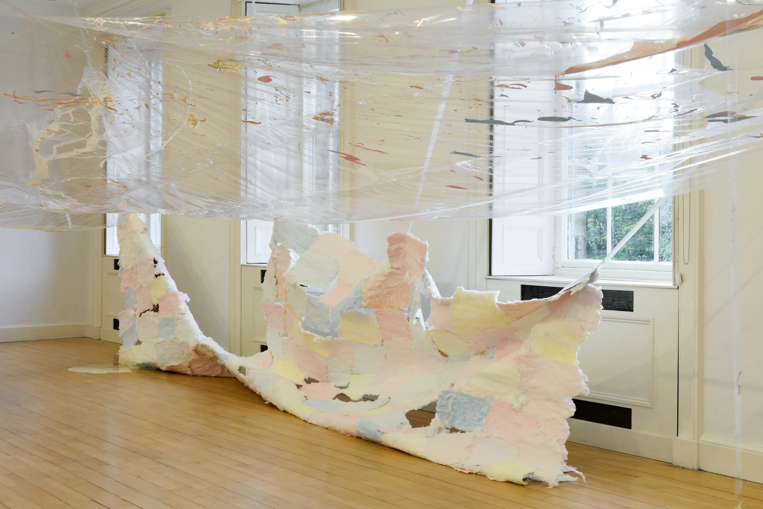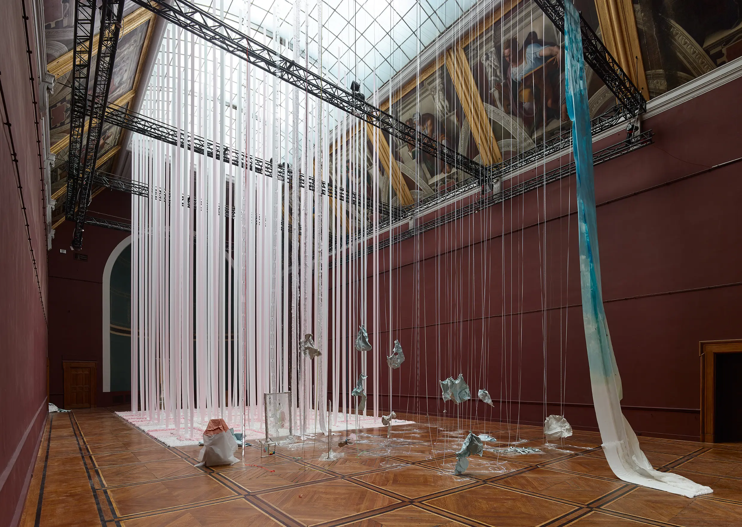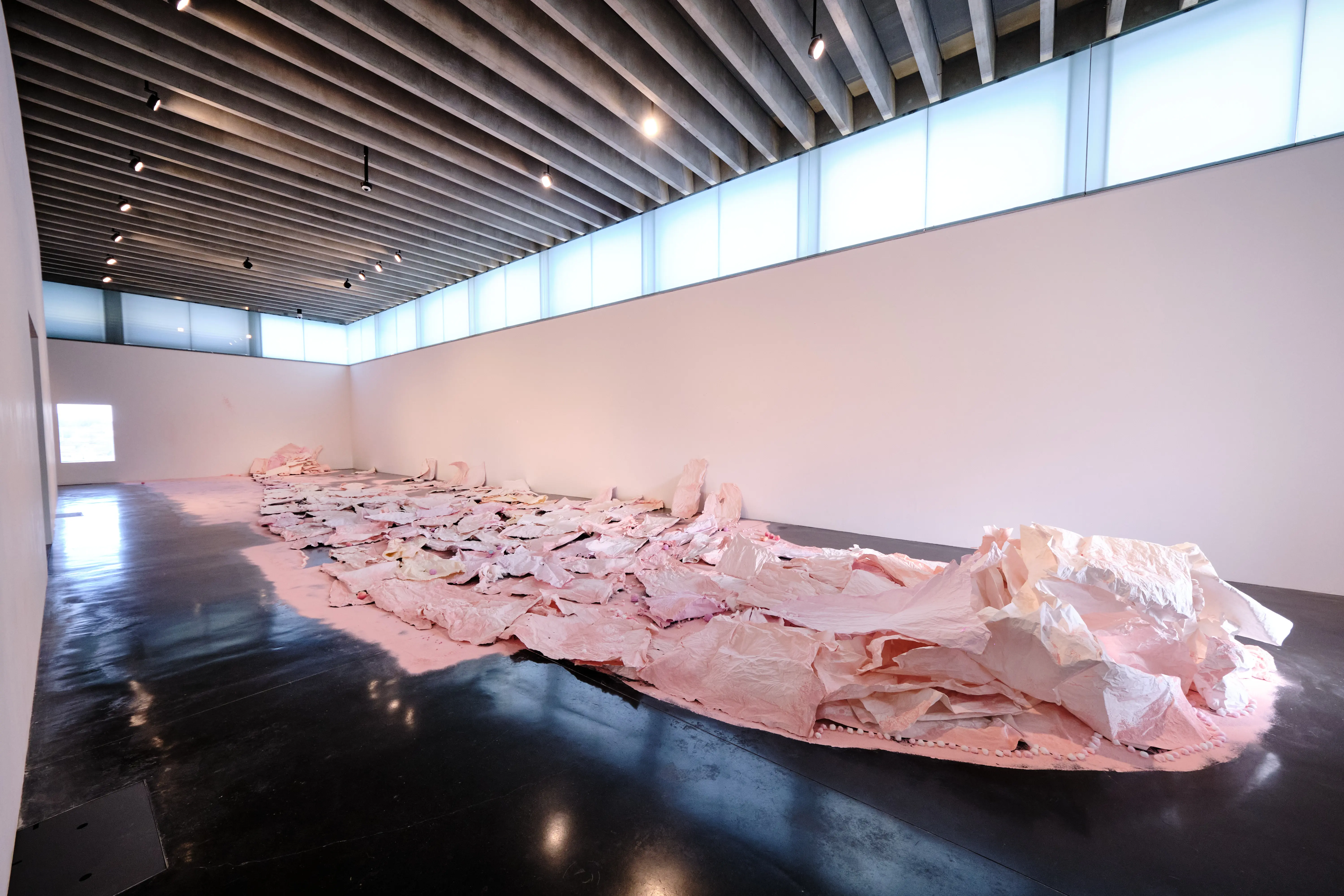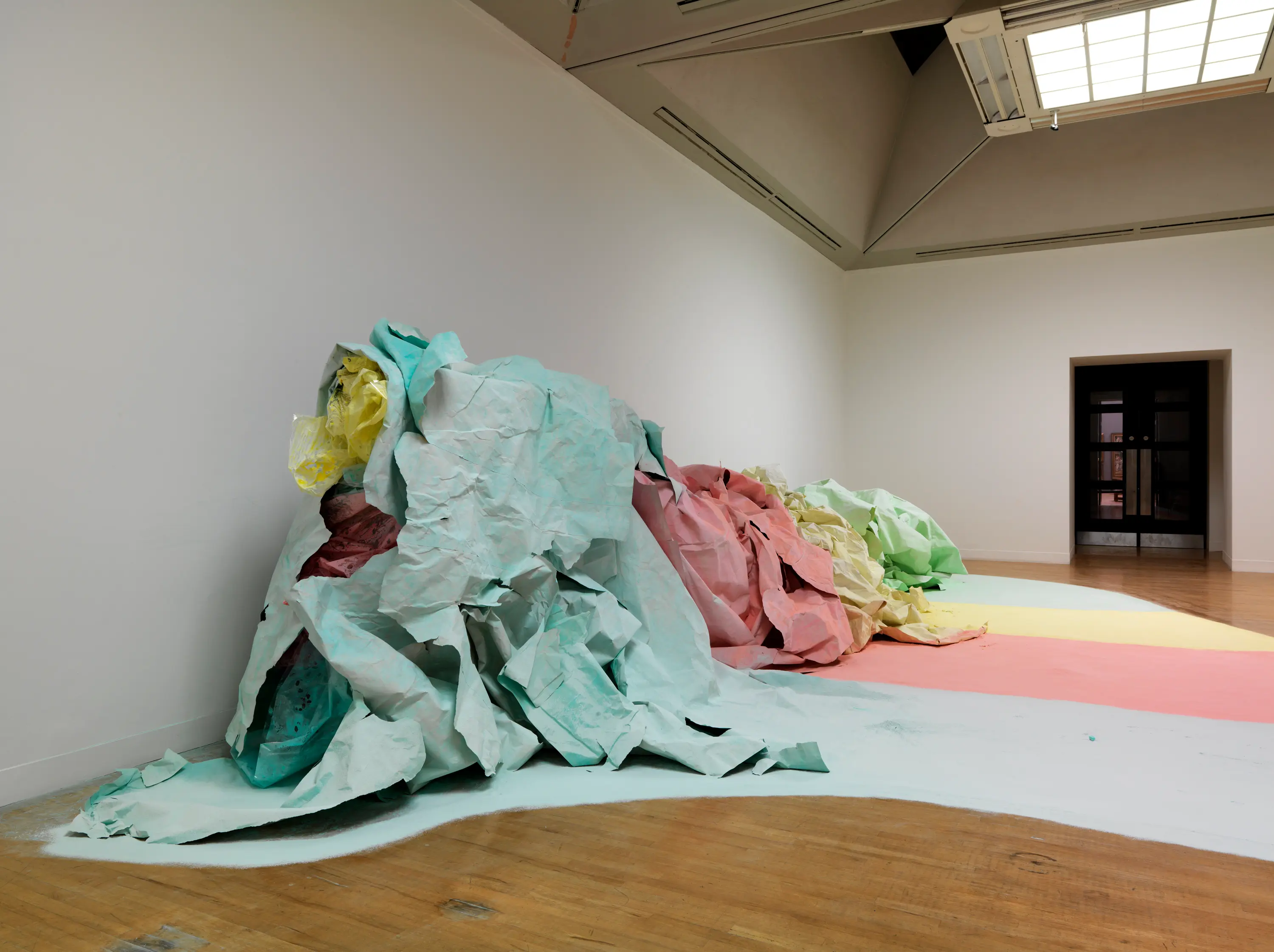 Karla Black was born in 1972 in Alexandria, Scotland, and lives and works in Glasgow. For the last twenty years, she has created abstract and immersive sculptures through her experimentation with unconventional materials. These monumental yet ephemeral and seemingly weightless chalked paper works continue Black’s investigation of materiality and texture, and the emotions they transmit.